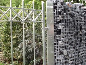 Detail: Der Pfosten als Blech, mit den Gabionen verschraubt.